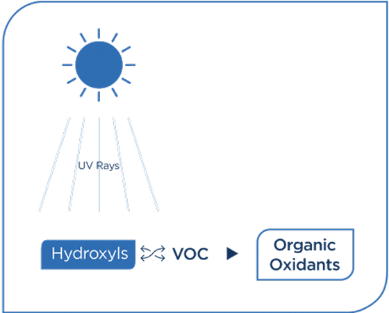 Hydroxyls react with volatile organic compounds (VOS) and produce organic oxidants, which also sanitize but are not as reactive so they exist longer then hydroxyls